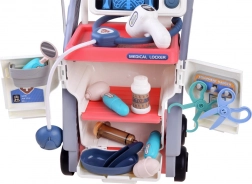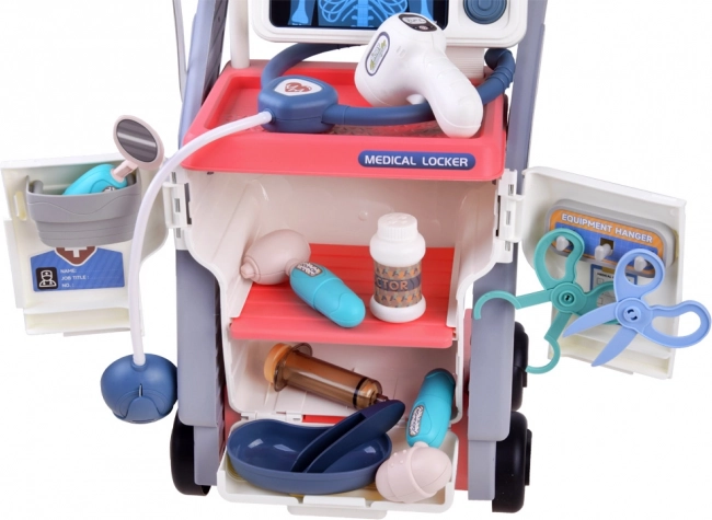 Il kit include un carrello con ruote, uno stetoscopio, una pipetta, un termometro, un otoscopio, un martelletto neurologico, una siringa, uno specchio e altro ancora.