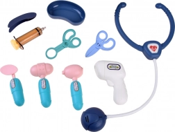 Il set include vari strumenti medici come lo stetoscopio, che grazie alle batterie già montate permette di ascoltare i battiti del cuore, o il termometro, che emette un breve suono e si illumina quando premuto.