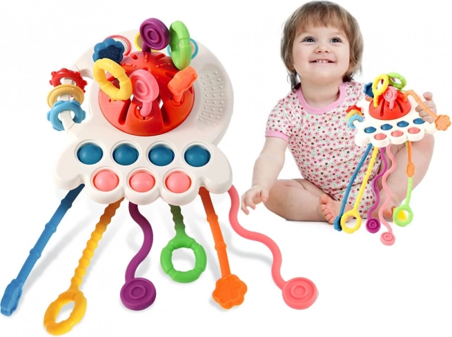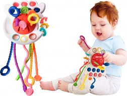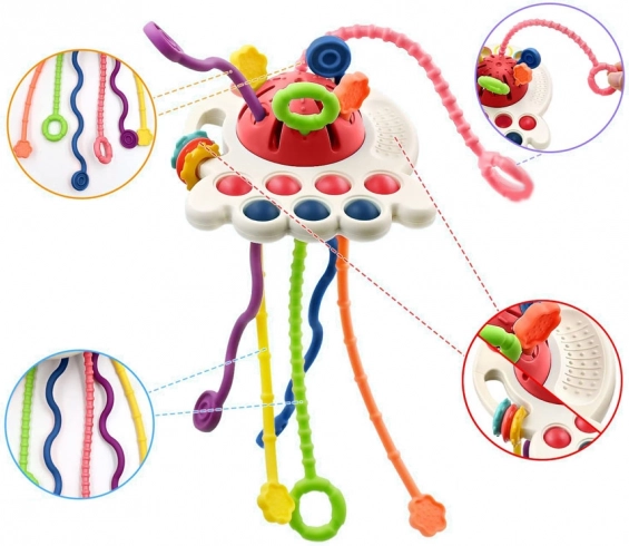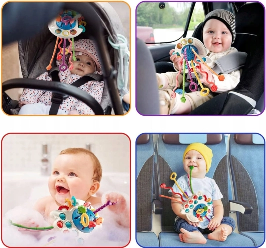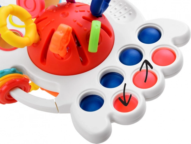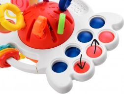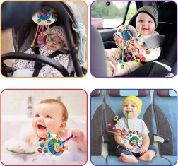 Il giocattolo ha pulsanti sensomotori morbidi che incoraggiano la manipolazione. I bambini possono godere di vari stimoli tattili attraverso tre anelli di plastica con diverse texture e una superficie con texture distintiva delle palline.