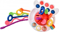 Il massaggiagengive appositamente progettato è dotato di sei corde testurizzate, che, quando tirate attraverso i fori, emettono diversi suoni e vibrazioni. Questa funzione aiuta ad aumentare la presa del bambino e a sviluppare abilità motorie.