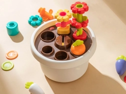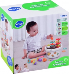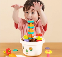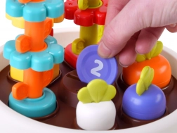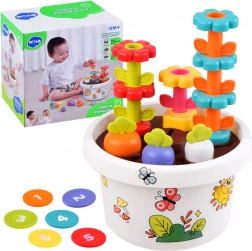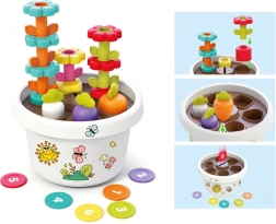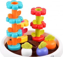 Il giocattolo supporta le capacità motorie fini del bambino grazie a elementi interattivi come fiori impilabili e gettoni colorati.