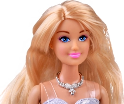 La bambola è vestita con una elegante gonna d'argento e indossa una bellissima collana, che sottolinea il suo aspetto alla moda.