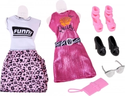 Il set include vari tipi di abbigliamento e accessori come vestiti con stampa leopardata e borse alla moda.