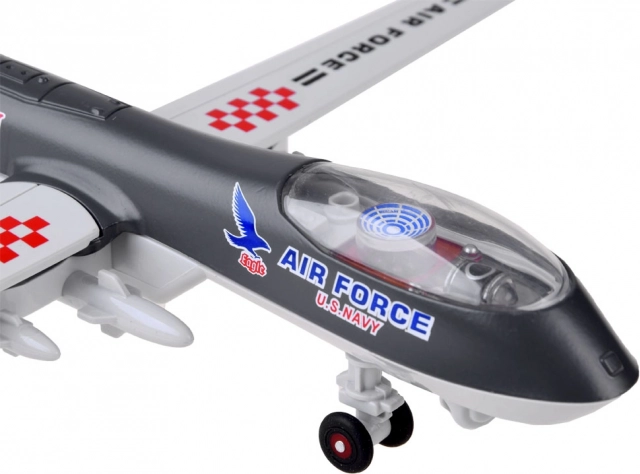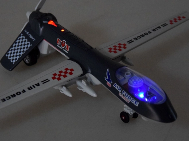 Posizionando il giocattolo su una superficie piana, si avviano le funzioni sonore e luminose. Sentirete suoni di decollo e funzionamento dei motori, spari, suoni di combattimento e la cabina e la coda si illumineranno. Il drone è progettato esteticamente con cura ai dettagli.