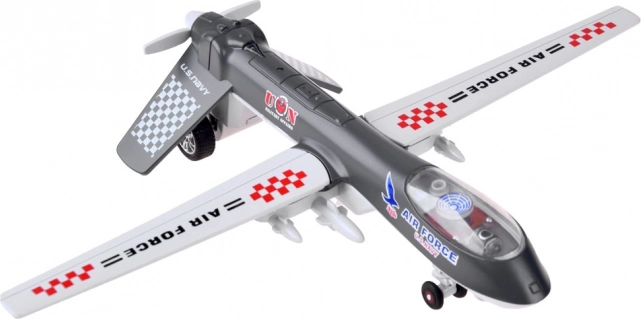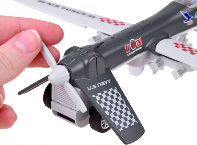 Il modello del drone militare rappresenta un fantastico giocattolo per tutti coloro che sono interessati alla tecnologia militare. Realizzato in metallo e plastica, questo drone è disponibile in colori neutri, mimetici ed è dotato di ali pieghevoli ed elica mobile. La caratteristica principale è il sistema di trazione "pull back" – basta tirare il giocattolo indietro e rilasciare per farlo muovere in avanti. Quando il drone prende velocità, l'elica si attiva e inizia a girare.