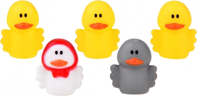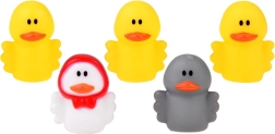 Il set comprende cinque papere: una bianca con bandana rossa, una grigia e tre gialle.