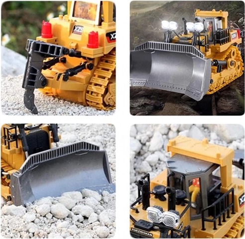 Il mezzo è dotato di luci e suoni: durante la guida senti il rumore del motore, in curva un allarme intermittente e durante il sollevamento/abbassamento della lama un caratteristico suono meccanico. Il controllo a 2,4 GHz è stabile, con funzioni di marcia avanti/indietro, sterzata e controllo elettrico della lama (il gancio posteriore è regolato manualmente). L’alimentazione è fornita dalla batteria 3,7 V 500 mAh inclusa, con ricarica via USB.