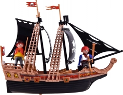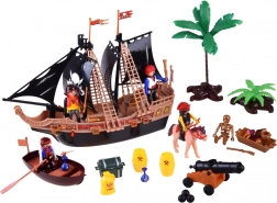 grande nave pirata; scialuppa con remi; cannone + 4 palline; 4 personaggi; cavallo; palma; cespuglio; scrigno; forziere dorato; scheletro; 2 botti; sacco; tesori (diamanti, coppa, sacchetti di monete); accessori (cappello, bandane, sciabole, fucile, cannocchiale)