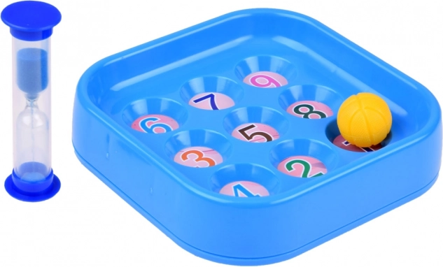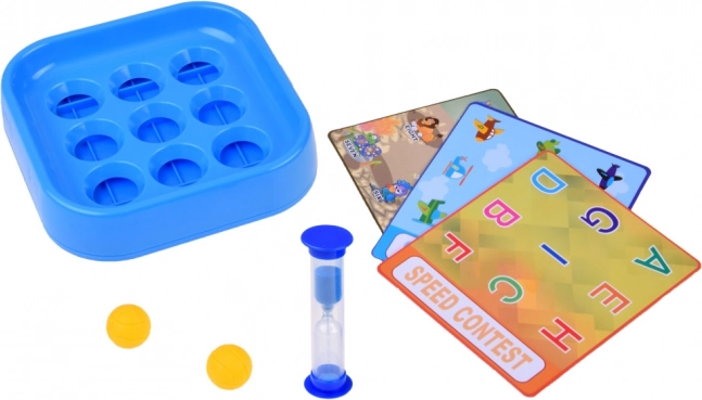 - Supporto in plastica, 3 carte bifacciali con tabelloni di gioco, 2 palline, clessidra
