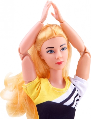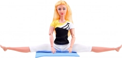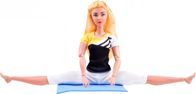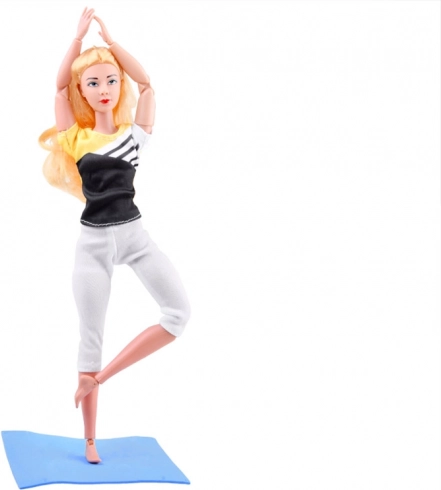 La bambola flessibile con lunghi capelli biondi indossa un completo sportivo con leggings elasticizzati e top, per allenarsi in totale comfort. La struttura articolata consente un posizionamento realistico di braccia, gambe e busto, così da imitare facilmente le asana e le posizioni ginniche preferite.