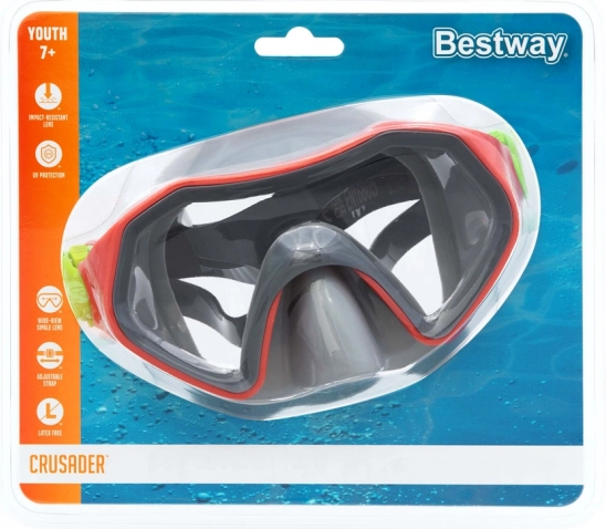 La leggera e resistente maschera da snorkeling per bambini Bestway Crusader è ideale per i piccoli esploratori dai 7 anni in su. Offre un ampio campo visivo, cinghie divise regolabili per una calzata confortevole, lente in policarbonato resistente agli urti e protezione UV per divertirsi in acqua in sicurezza senza irritazioni agli occhi.