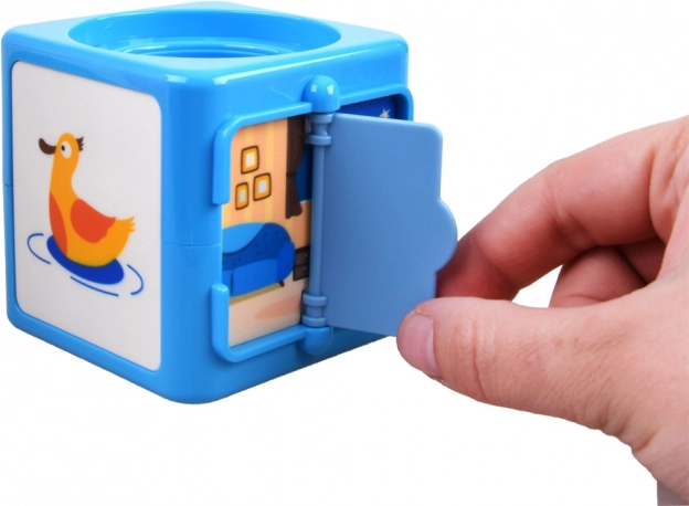 - Il blocco blu ha: una finestra con ante, stelle nel cielo notturno, divani da interno, un'anatra, una fragola, fori per le sfere.