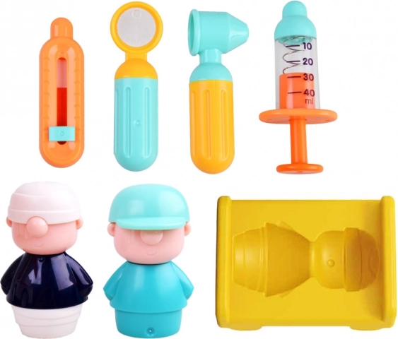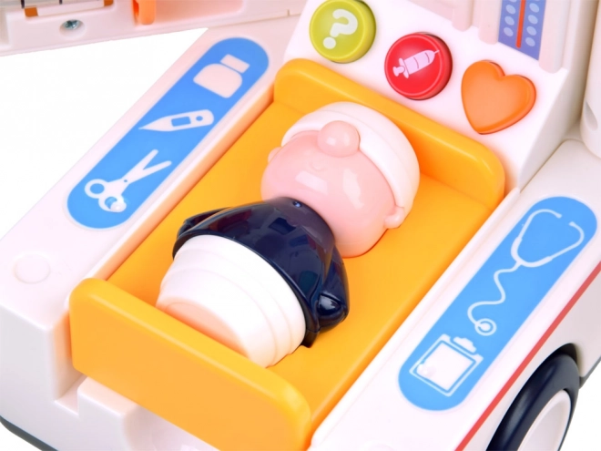 L’ambulanza è dotata dei seguenti strumenti e accessori: - termometro - specchietto auricolare - specchietto laringologico - siringa - barella - personaggio paziente - personaggio universale medico/soccorritore/autista