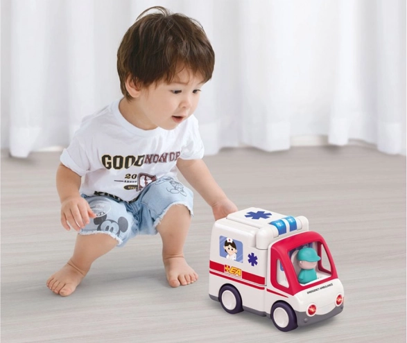 Caratteristiche principali del prodotto: - Guida autonoma: Il veicolo può muoversi da solo e cambia direzione quando incontra un ostacolo. - Effetti sonori: Include suoni di avviamento del motore, sirena dell’ambulanza, clacson, musica allegra e rumore di frenata. Gli effetti luminosi includono luci lampeggianti. - Interruttore funzionale: Sotto il veicolo è presente un interruttore per scegliere tra modalità statica e dinamica.
