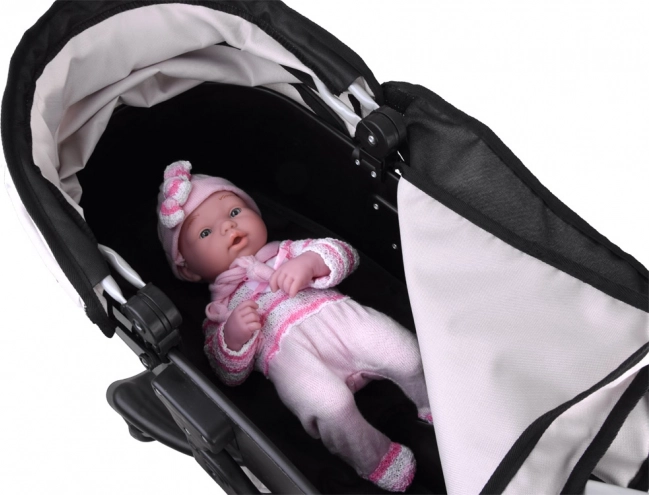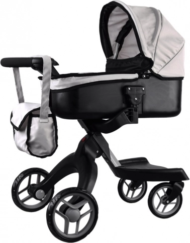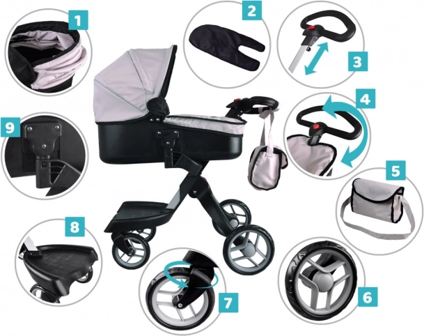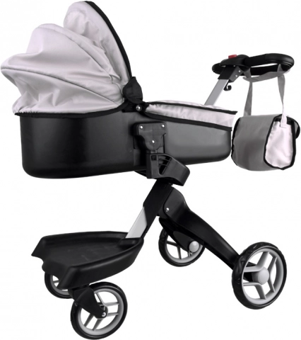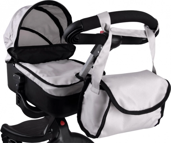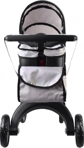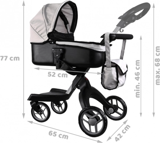 Moderna carrozzina a gondola per bambole, permette a ogni bambino di portare a passeggio la sua bambola preferita, orsetto di peluche, mascotte. Carrozzina spaziosa con design moderno, molto facile da guidare grazie alle grandi ruote in schiuma, il manico della carrozzina può essere facilmente regolato in base all'altezza del bambino. La carrozzina ha spazio sufficiente per collocare la bambola su un morbido materasso, il cappuccio della carrozzina è pieghevole e ha una copertura rimovibile. La carrozzina è inoltre dotata di una spaziosa borsa per gli accessori necessari.