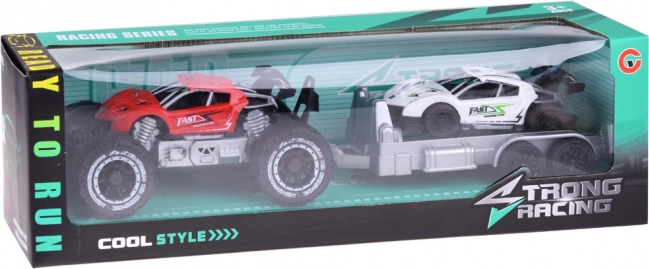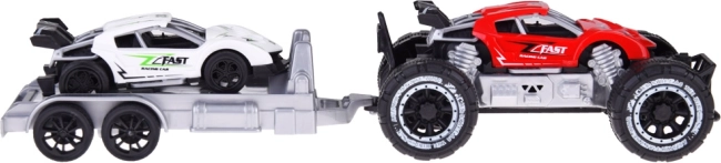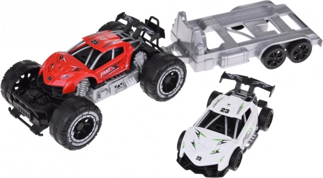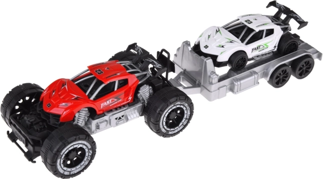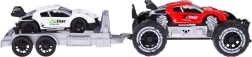 Auto fuoristrada e macchinina sportiva con rimorchio offre divertimento per ogni piccolo appassionato di motori. Le macchinine sono realizzate in plastica, il rimorchio è ideale per trasportare l'auto sportiva alle gare.