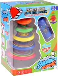 Questo set piramidale di trottole colorate è progettato per bambini di diverse fasce d’età. Con l’aiuto della pratica impugnatura (launcher) le trottole si mettono facilmente in rotazione, garantendo un movimento fluido e accattivante sul tavolo o sul pavimento. Il giocattolo favorisce coordinazione occhio–mano, pazienza e concentrazione.