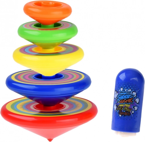 Cinque trottole di dimensioni diverse invogliano a sfide per la rotazione più lunga e alla creazione di una divertente piramide rotante.