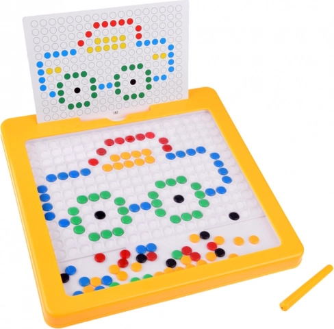 Il mosaico magnetico educativo YOKOMISIADA unisce gioco e apprendimento in un unico prodotto. I bambini inseriscono i perni colorati nella griglia seguendo i modelli (auto, farfalla, fiore e altri) oppure creano le proprie immagini. La superficie magnetica facilita la manipolazione e mantiene gli elementi in posizione, rendendo il gioco fluido e senza disordine inutile.