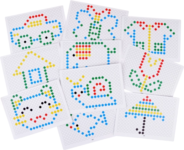 Il set include carte con motivi (auto, casa, pesce, fiore ecc.) che i bambini riproducono sulla griglia usando i perni colorati. Imparare forme e pattern è divertente e intuitivo.