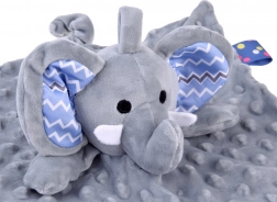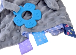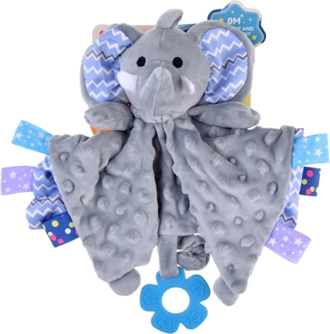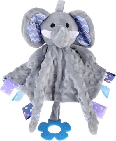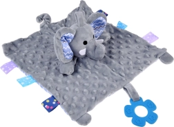 Dolcissima copertina coccola in peluche a forma di elefantino che offre al bebè una carezza morbida, un massaggiagengive in silicone per dare sollievo durante la dentizione e texture diverse con etichette per l’esplorazione tattile. Leggera, sicura e ideale per lettino, passeggino e seggiolino auto.