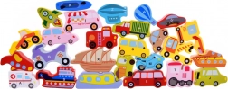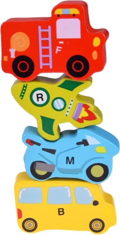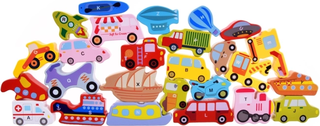 Ogni pezzo rappresenta un veicolo diverso e una lettera. I bambini assimilano naturalmente le lettere mentre nominano auto, barche, treni o aerei.