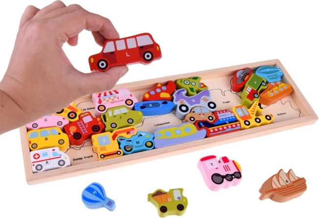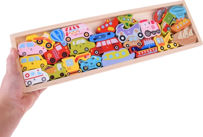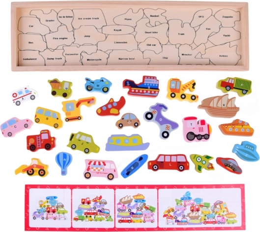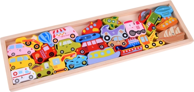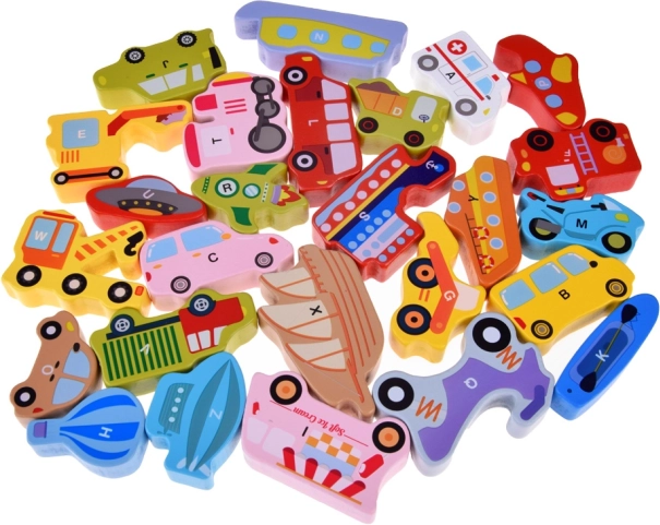 Questo set in legno include 27 veicoli colorati – dall’auto, autobus e camion dei pompieri fino alla mongolfiera, barca, razzo e dirigibile – e una base in legno con nomi indicati. Ogni pezzo porta una lettera da A a Z (incluso un motivo speciale), aiutando i bambini a imparare l’alfabeto in modo divertente e ad ampliare il vocabolario.