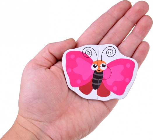 Le illustrazioni favoriscono il riconoscimento di forme e colori, mentre l’incastro a due pezzi rafforza la logica e la motricità fine.
