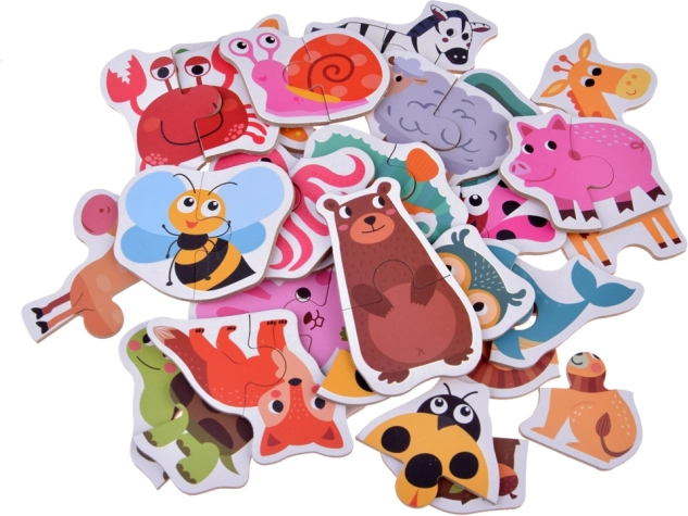 Questo set variopinto include graziose illustrazioni di animali della savana, del bosco, del cortile, del prato e dell’acqua. Ogni soggetto è composto da due pezzi più grandi, facili da impugnare e assemblare dai bambini. Grazie alla semplicità del principio di gioco, i bambini acquisiscono rapidamente sicurezza e gioia per il successo.