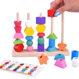 Questo versatile giocattolo in legno offre due modalità di gioco: infilare perline colorate sui lacci e impilare le forme su una base con cinque pioli seguendo i modelli. Grazie ai colori accesi e alle varie forme geometriche, sostiene naturalmente lo sviluppo della vista, del tatto e della percezione spaziale.