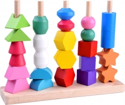 Questo versatile giocattolo in legno offre due modalità di gioco: infilare perline colorate sui lacci e impilare le forme su una base con cinque pioli seguendo i modelli. Grazie ai colori accesi e alle varie forme geometriche, sostiene naturalmente lo sviluppo della vista, del tatto e della percezione spaziale.