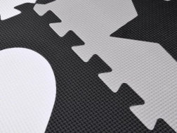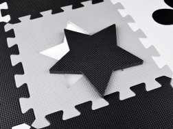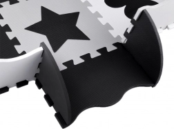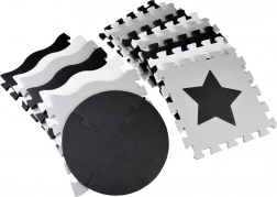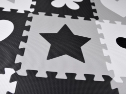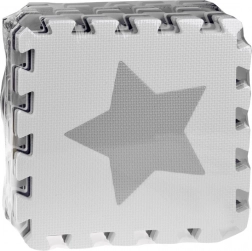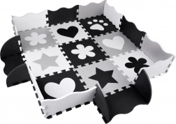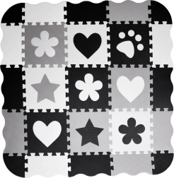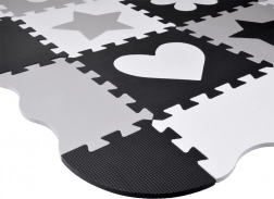 Un tappetino per bambini in puzzle di schiuma, elegante e sicuro, nelle tonalità di grigio, nero e bianco, che crea uno spazio di gioco morbido e igienico. Il set include 16 grandi pezzi con forme rimovibili, finitura antiscivolo e isolamento termico. Grazie alla possibilità di collegare anche in altezza si può creare un piccolo recinto/spazio delimitato per giocattoli o palline.