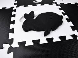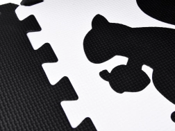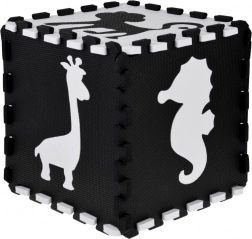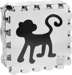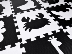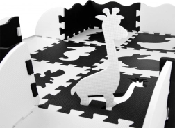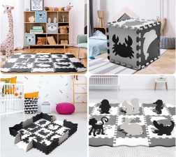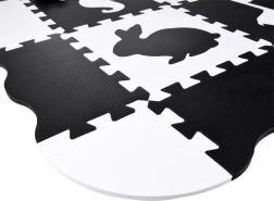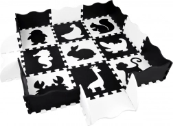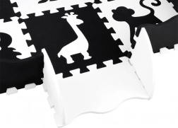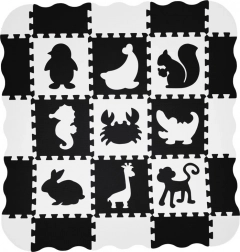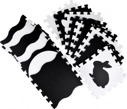 Elegante tappetino in schiuma nero‑bianco composto da 16 pezzi che crea uno spazio di gioco sicuro e confortevole per neonati e bambini più grandi. I colori a contrasto stimolano la vista, la morbida schiuma EVA assorbe gli urti e la superficie bifacciale con struttura antiscivolo aumenta la sicurezza. I pezzi possono essere combinati liberamente, sollevando i bordi in altezza per creare un spazio chiuso per giocattoli o palline.