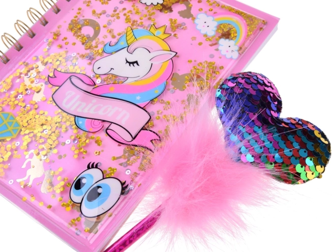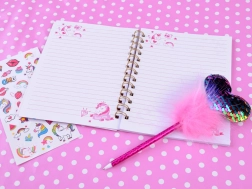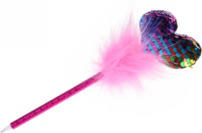Penna rosa con paillettes e top soffice che aggiunge magia a ogni scrittura.