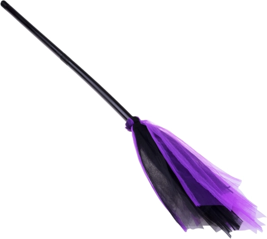 Scopa leggera con manico in plastica e finiture nero-viola, ideale come accessorio per costumi di carnevale e Halloween.