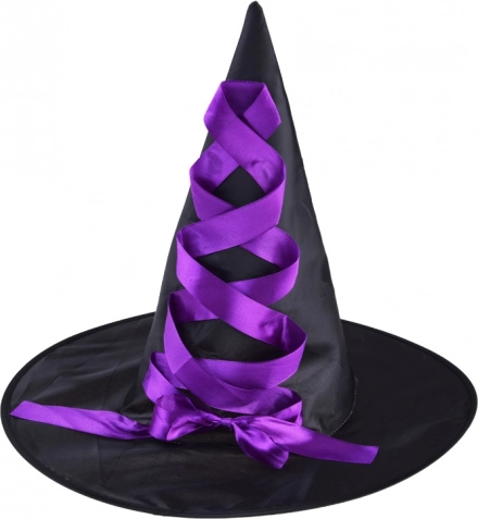 Il cappello da strega nero è impreziosito da un nastro di raso viola. La forma rigida e il contrasto deciso dei colori completano un look magico.
