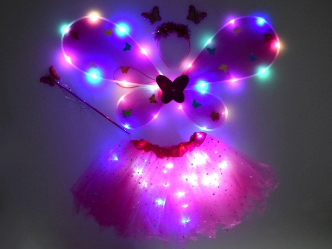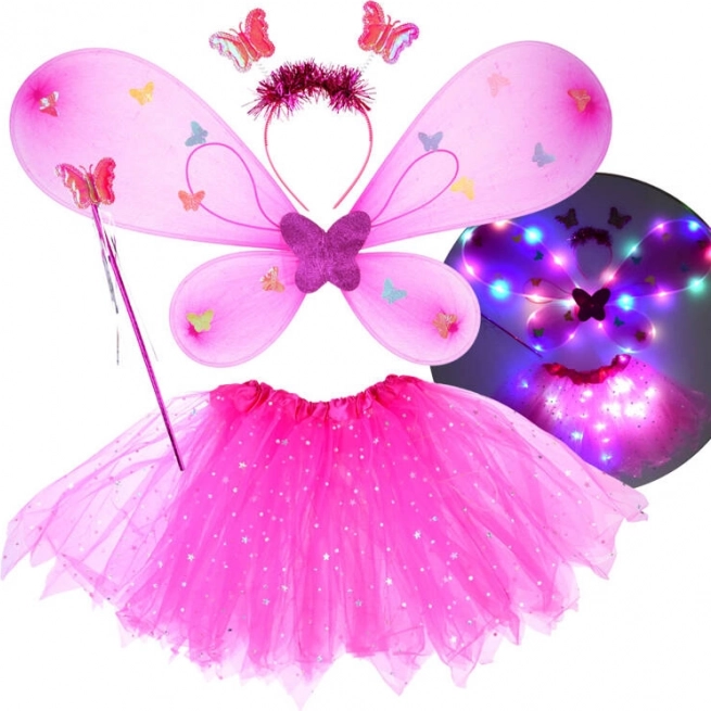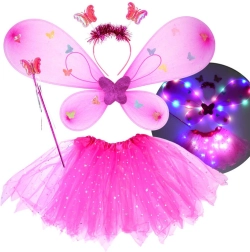 Incantevole set per travestimenti per bambini composto da tutù rosa, ali di farfalla, cerchietto e bacchetta magica. Grazie alle luci LED integrate nella gonna e nelle ali crea un effetto magico che illumina ogni carnevale, festa e gioco in casa. La vita elastica e il tulle leggero con stelline scintillanti garantiscono comodità e fantasia senza limiti.