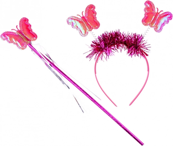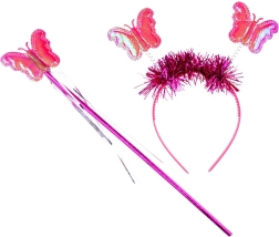 Colorate ali di farfalla, cerchietto e bacchetta completano un perfetto look da fata per carnevali e giochi in casa.