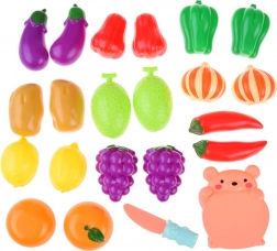 La verdura/la frutta è anch’essa in plastica in colori vivaci. Si uniscono tra loro con gancetti in velcro, così il bambino potrà giocare a tagliarle.