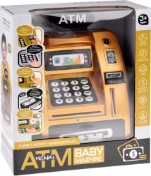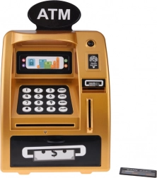 Incontra il bancomat dorato, che appare e funziona come un vero bancomat. È fatto di plastica con un design realistico che include una tastiera, un display digitale e uno slot per carta. Inserendo la carta giocattolo e inserendo il codice PIN, i bambini attivano le funzionalità del bancomat.