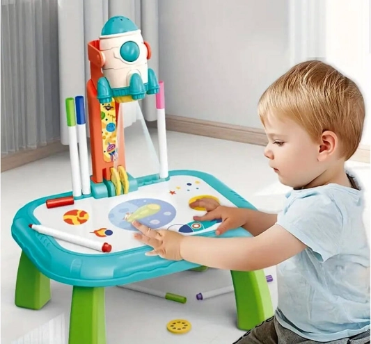 Il braccio del proiettore è regolabile in altezza e in angolazione per un disegno confortevole. Scegliete tra i dischi tematici – spazio, animaletti, veicoli o mondo sottomarino – e lasciate che i piccoli artisti scoprano nuovi soggetti. In modalità notturna il proiettore proietta stelle su parete o soffitto, una coccola anche prima della nanna.