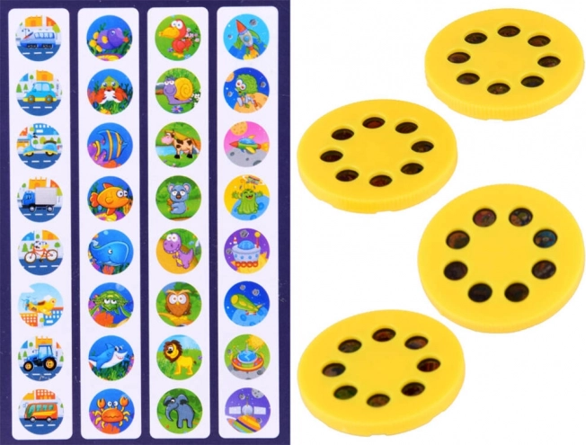 Include 8 pennarelli colorati, 4 dischi con motivi (spazio, animaletti, veicoli, mondo sottomarino), una scorta di fogli e una stabile tavoletta da disegno – non serve nient'altro.