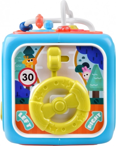 - pianolino con luce, melodie e canzoncine (EN), suoni di animali, effetti percussivi, labirinto con perline, ingranaggi, inserimento forme, orologio con lancette, volante, melodia promemoria in caso di inattività