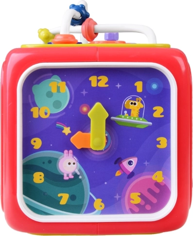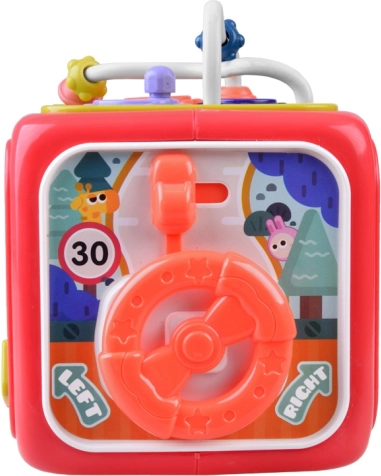 Questo cubo educativo multifunzionale è progettato per crescere con il tuo bambino. Su ogni lato c’è un’attività diversa: pianolino luminoso con canzoncine e suoni di animali, elementi meccanici per le dita, volante per i piccoli guidatori, orologio per imparare l’ora e sorter per riconoscere forme e colori. Grazie alle dimensioni compatte è ideale per passeggiate e viaggi.