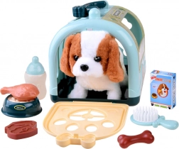 Cagnolino di peluche, trasportino portatile, spazzola, biberon per l’alimentazione, ciotola con finta pappa, osso, coscia di pollo, bistecca, scatolina con finto mangime, adesivi