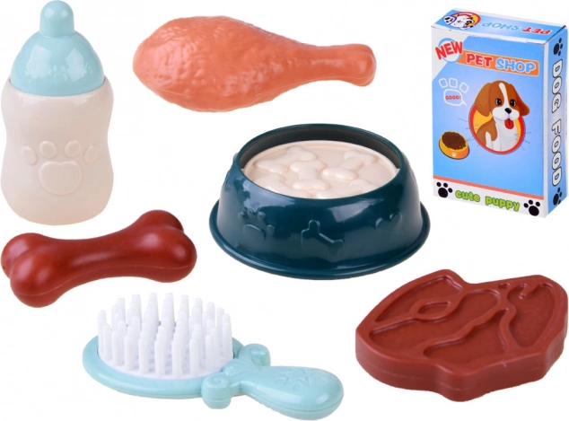 Il set include una ciotola con finta pappa, biberon, spazzola, osso, coscia di pollo, bistecca, scatolina con mangime e adesivi: tutto per una cura realistica.