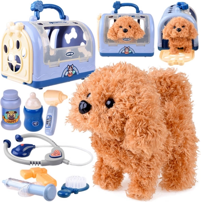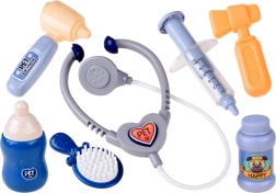 Stetoscopio, siringa, otoscopio, martelletto neurologico, spazzola, boccetta e finte medicine – tutto per un esame realistico e la cura del cucciolo.