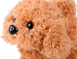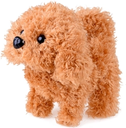 Il cagnolino cammina in avanti, abbaia, scodinzola e, quando lo accarezzi, emette teneri suoni da cucciolo. Il morbido pelo caramello riccio invita alle coccole.