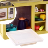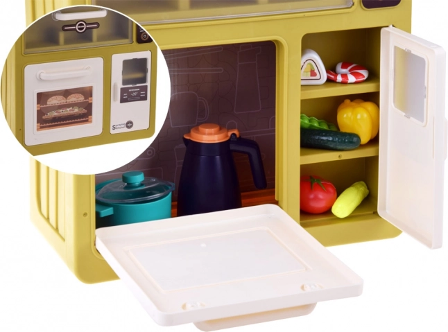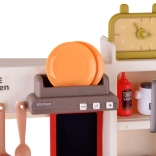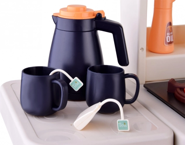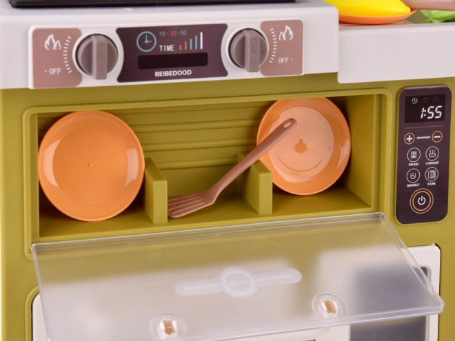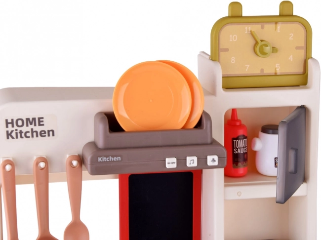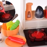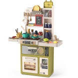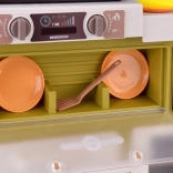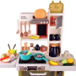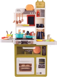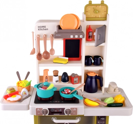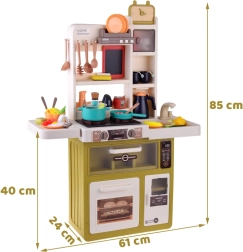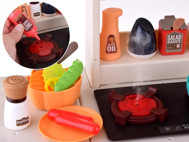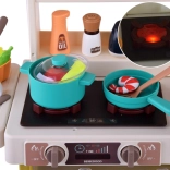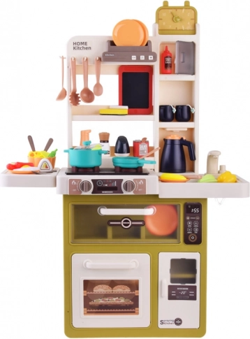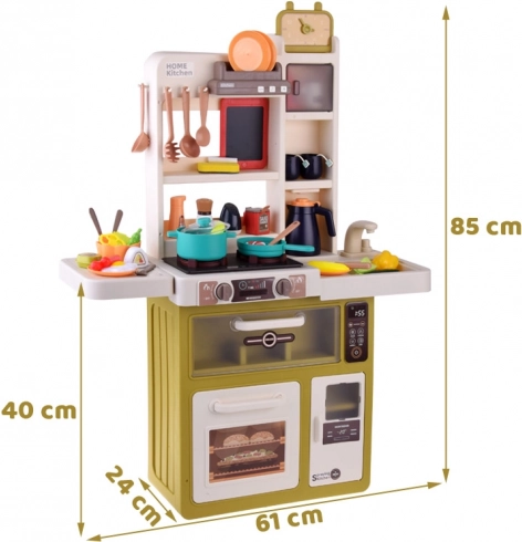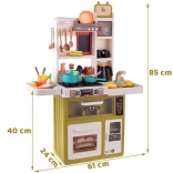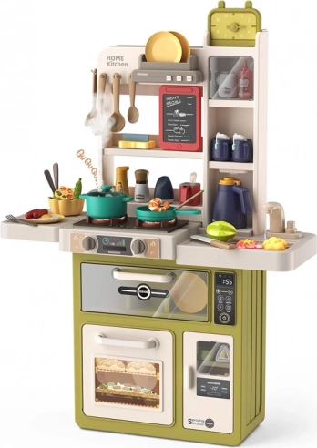 Questa cucina interattiva offre ai bambini un’autentica esperienza di cucina. Dispone di cucina con due piastre, forno, frigorifero, lavastoviglie, lavello con rubinetto funzionante a circuito chiuso e mensole superiori con ganci. Dopo aver riempito il serbatoio (circa 40 ml), da un bruciatore durante la cottura si alza vapore realistico e le piastre si illuminano. La cappa offre melodie e suoni che rendono il gioco ancora più coinvolgente.