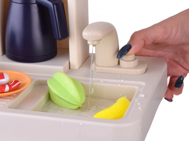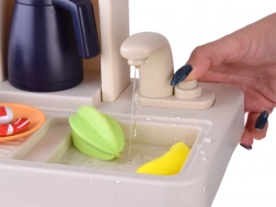 Il lavello con rubinetto ricircola l’acqua in un circuito chiuso. I bambini possono così “lavare” alimenti e stoviglie senza disordine e con il massimo divertimento.